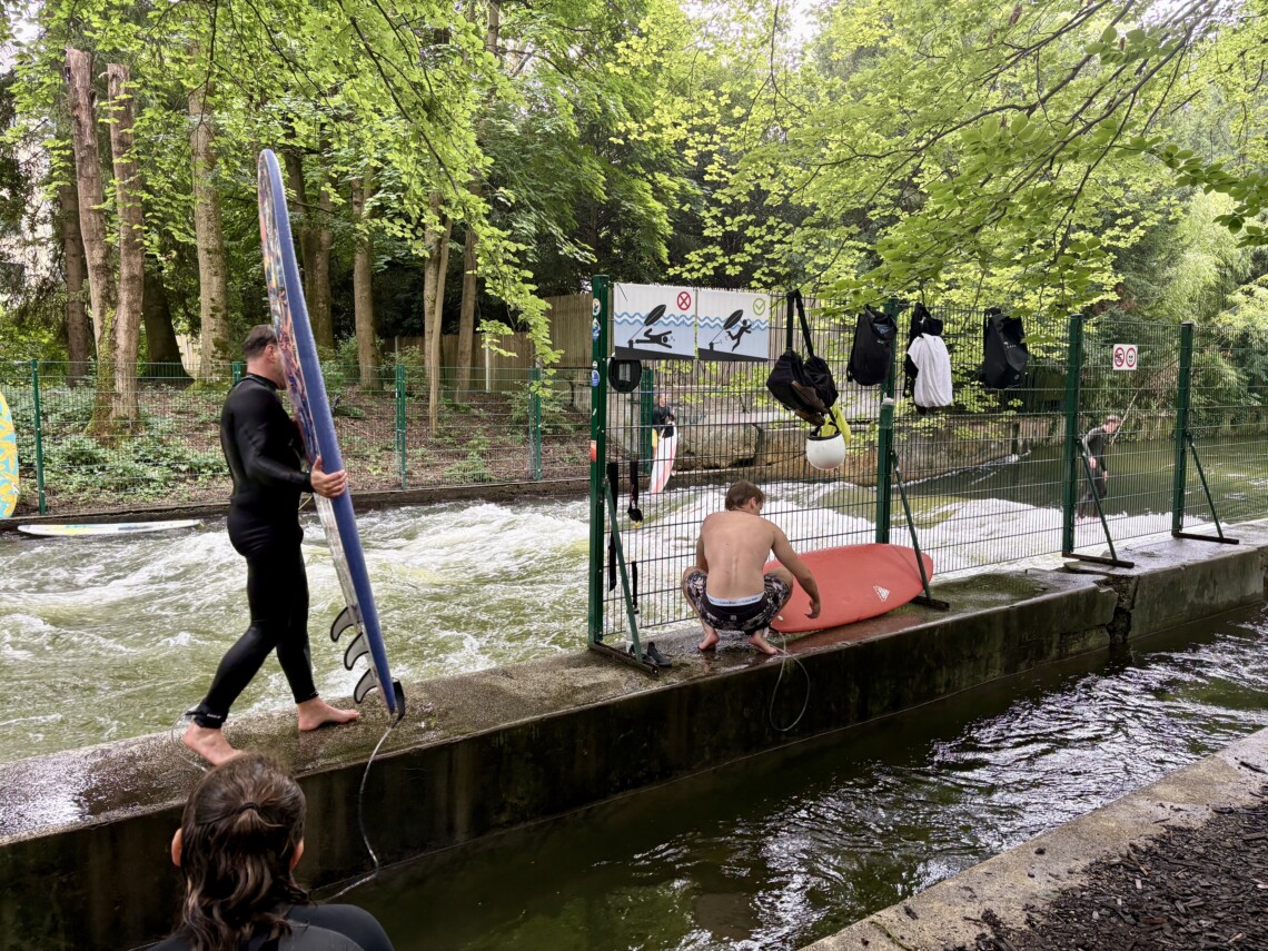 公園内を流れるアイスバッハ川(Eisbach)の特定の場所では、流れの段差でできる波(Eisbachwelle)に乗ってリバーサーフィンを楽しめます。